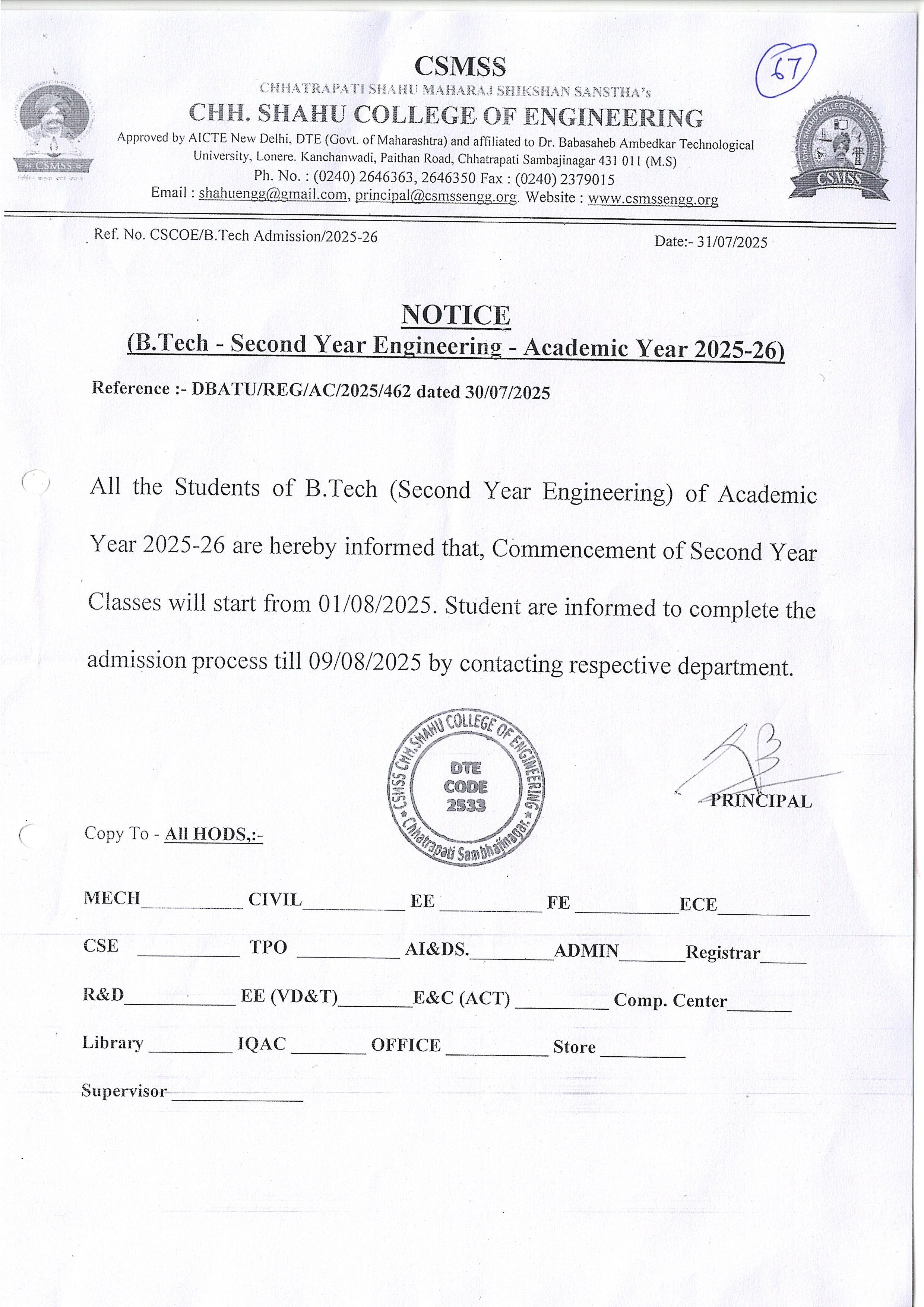 7. B.Tech Second Year Commencement of Classes.